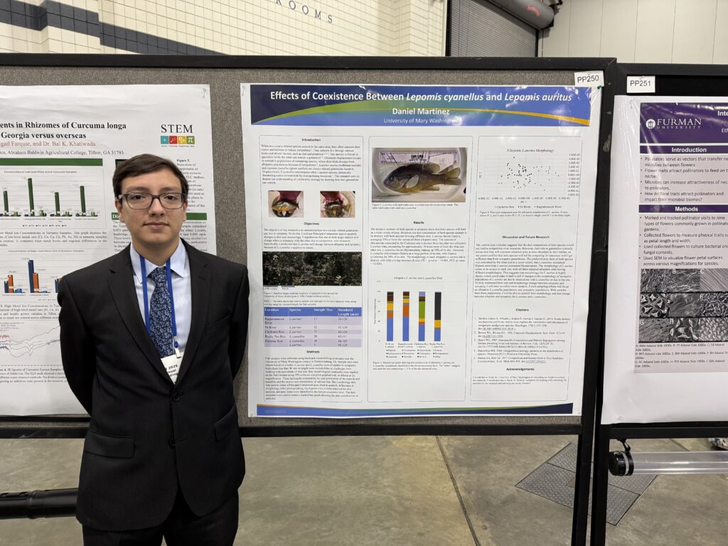 Hello, I am Daniel Martinez, and I am a senior Geology and Conservation Biology student at the University of Mary Washington in Fredericksburg, Virginia. My interests cover paleontology, evolutionary biology, and marine biology with a focus on how intraspecies and interspecies interactions can cause evolutionary changes. During my time at the University of Mary Washington, I took advantage of some amazing opportunities to do conservation work through the university’s study abroad programs, specifically a trip to Bonaire, in the Caribbean Netherlands, to restore the coral reefs and one to the Galapagos Islands, Ecuador, to aid in reforestation. I have also had the opportunity to gain research experience studying adaptive phenotypic plasticity in margin madtom catfish. My current research project aims to find the effect that two closely related generalists have on one another when coexisting. After I graduate, I hope to go on to graduate school to get a Ph.D. in evolutionary biology, paleontology, or marine biology.