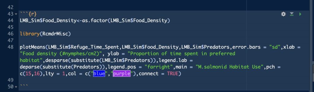 During my time at the University of Mary Washington I learned how to use R Coding to analyze and graph my data. The pictures below are from a project that I worked on while learning how to use R Coding. The pictures show the code and scatter plot made from simulated data about largemouth and smallmouth bass habitat use. I have included the R file that shows all the work that I did to analyze and graph my data. This project was difficult because the data I had did not meet the assumptions to run a parametric test. To fix this, I tried to transform my data to meet normality, but my data could not be transformed. This lead me to run a Kruskal Wallis rank sum test. During this project, I learned not only R coding skills, but I also honed my critical thinking skills and problem-solving kills. The new skills helped me to better analyze my data and try to make my data meet the assumptions for a parametric test. I enjoyed working on this project because it reinforced my desire to continue to cinduct research after I graduate. This project has allowed me to grow as a researcher and I am now more confident when analyzing data and more comfortable working with a complex and sometimes troublesome system like R Coding. With the skills I learned from this course and from conducting this research I am confident that I can have success when pursuing post graduate opportunities.
